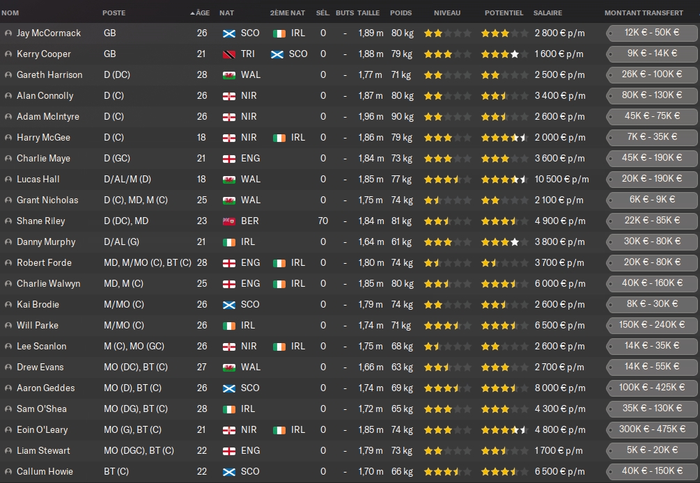 | Joueur | Pos. | Club | Prix | S | M | B | Pd | Note |