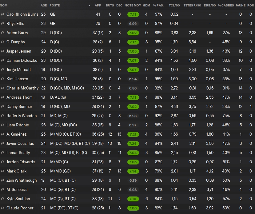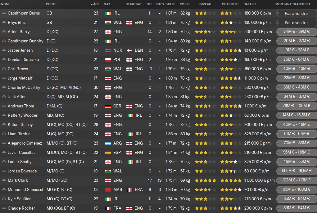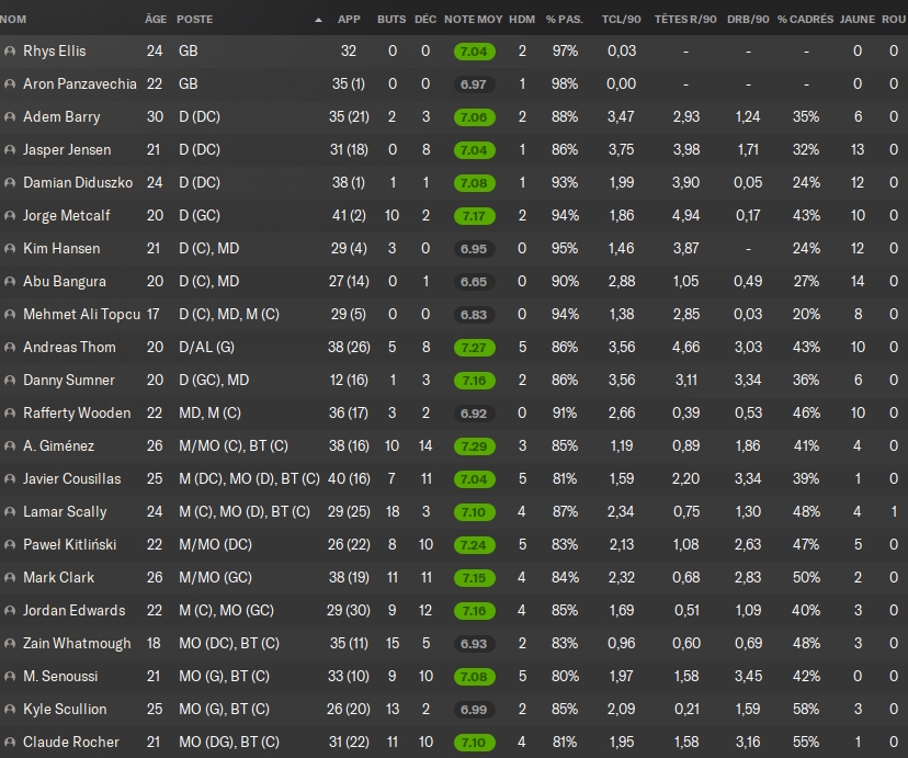 | Joueur | Poste | Club | Prix | S | M | B | Pd | Note |