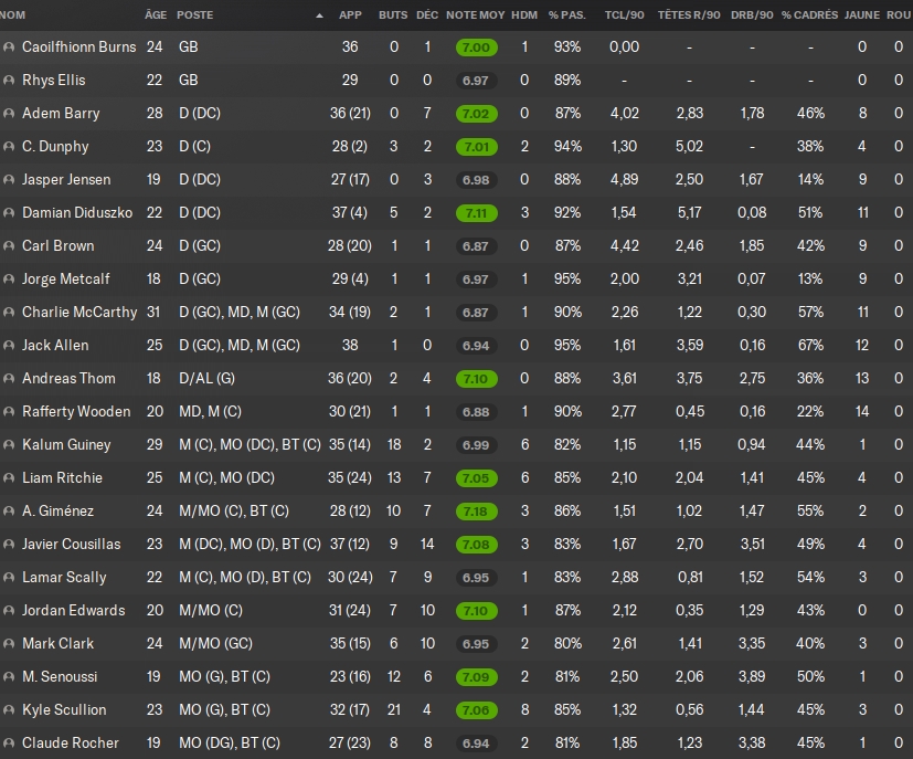 Domicile Extérieur Possession % têtes remportées Cartons jaunes Cartons rouges Affluence moyenne Masse salariale annuelle |