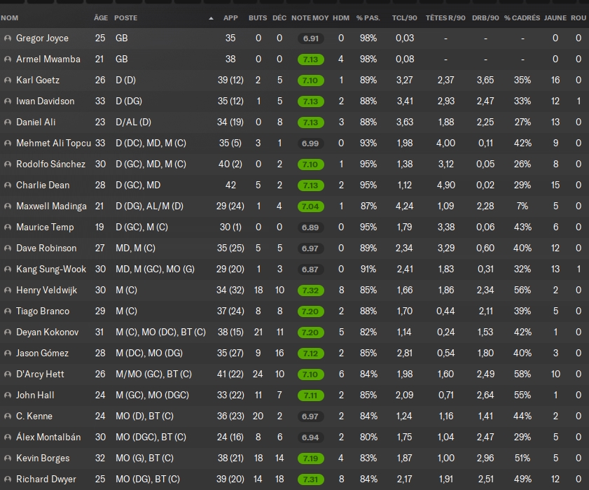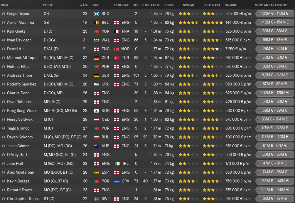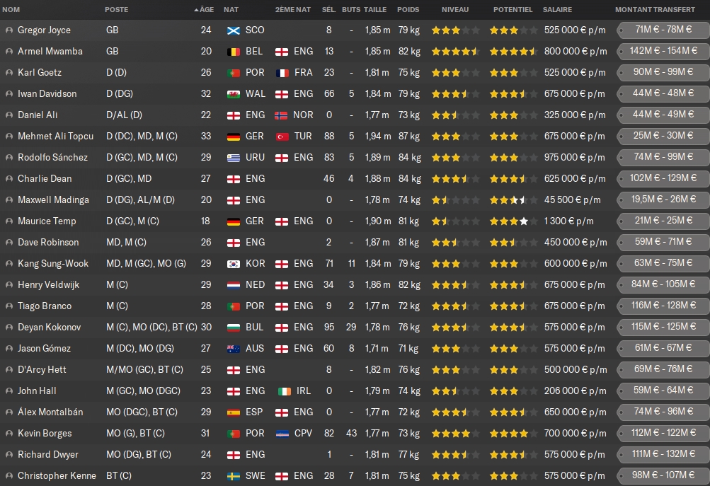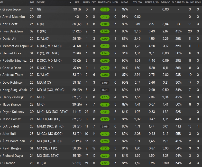 | Joueur | Poste | Club | Prix | S | M | B | Pd | Note |