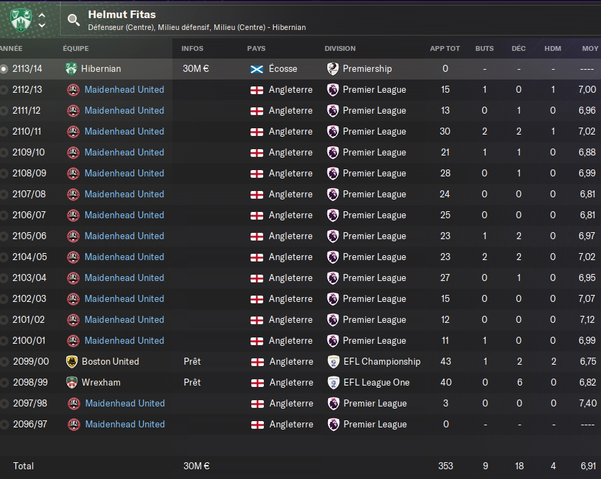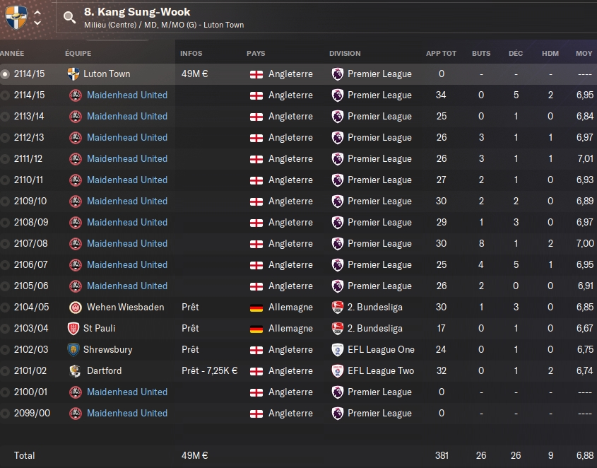 | Matchs gagnés | 4242 | Buts encaissés | 5049 | Promotions | 10 |