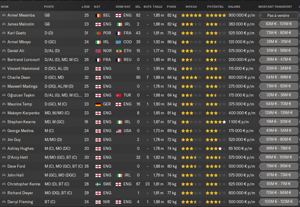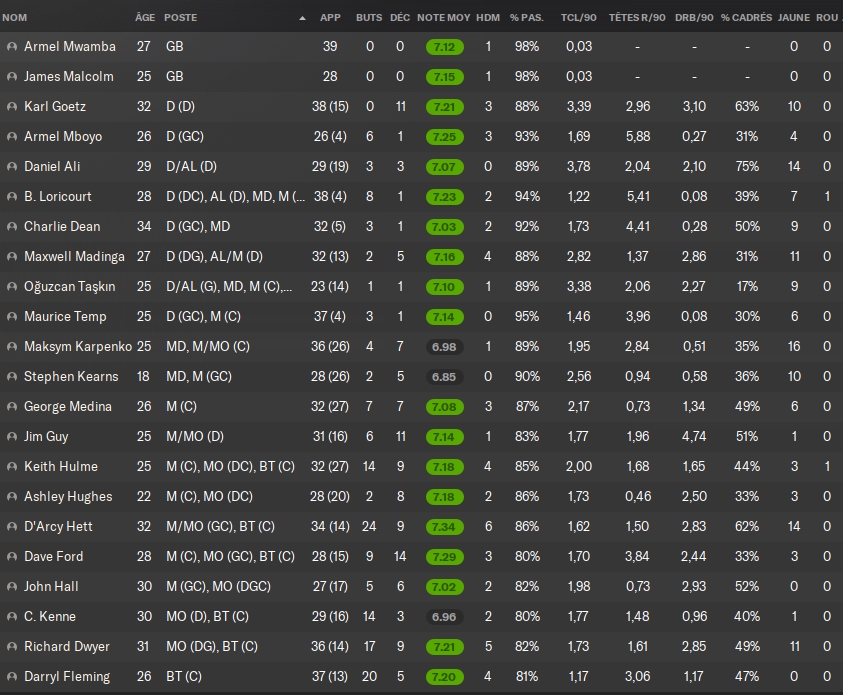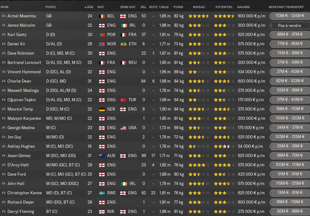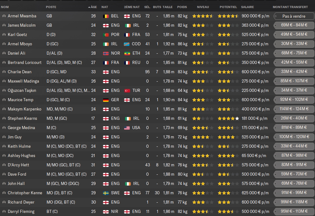 | Joueur | Pos. | Club | Prix | S | M | B | Pd | Note |