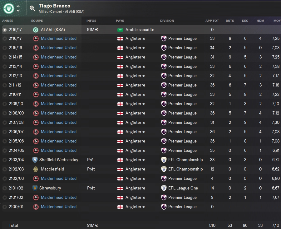 | Matchs joués | 6123 | Buts marqués | 13687 | Titres championnat | 58 |