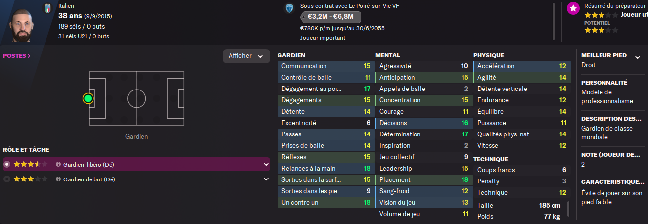 LĂ©gende Italienne au mĂȘme titre quâun BUFFON, on le recrute lors de la saison 2038/2039 pour dâabord ĂȘtre la doublure de KNEZEVIC pendant 3 ans.