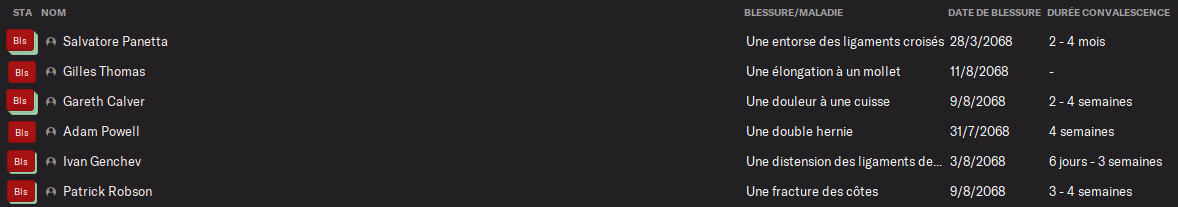 Par contre, on a deux pépins physiques en fin de mois avec TESCHE qui est indispo 1 mois et demi (clavicule) et ROBSON (mollet).