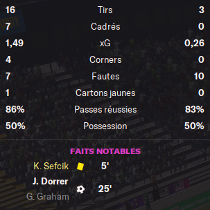 19â : Faute intelligente mais nĂ©cessaire de GRAHAM qui prend jaune en arrĂȘtant une contre attaque. SANTARSIERO venait de recevoir le ballon dans le rond central et nâaura pas le temps de se retourner.