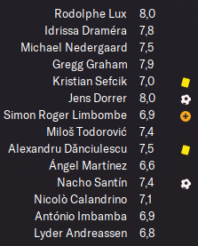 Sur cette action, Le Poiré fait tourner avec les sorties de LIMBOMBE et NEDERGAARD. MARTINEZ et ANDREASSEN rentrent.