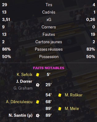 81â : Ouverture dâAJANA en direction de SKRABACK qui gagne son duel de la tĂȘte face Ă SEFCIK. Il parvient Ă dĂ©vier dans la course de MAGDIEL.