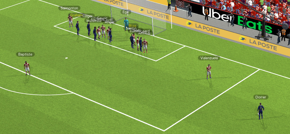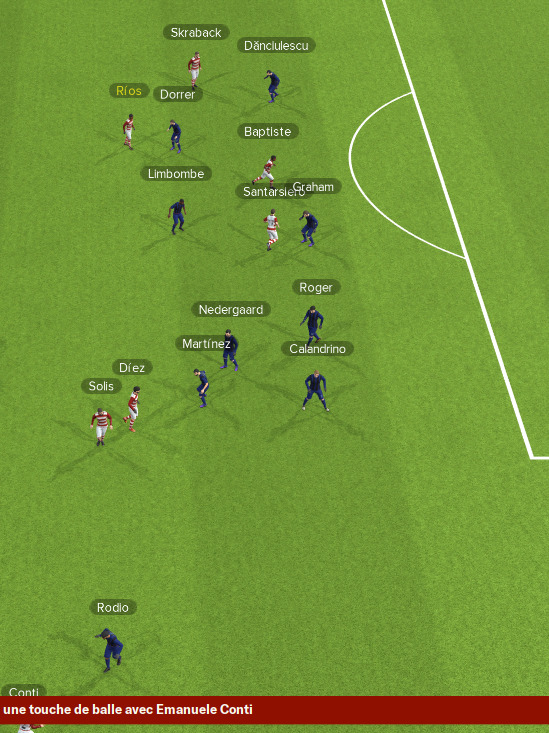 La Roche joue ce match avec un formation lĂ©gĂšrement diffĂ©rente. Les ailiers sont plus bas et les MC sont presques tous les deux derriĂšre lâattaquant.