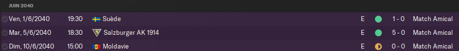 On trouve des matches amicaux Ă la derniĂšres minutes Ă©tant donnĂ© quâon ne savait mĂšme pas si on allait etre de la partie. Les rĂ©sultats sont moyen et on ne part pas avec une confiance.