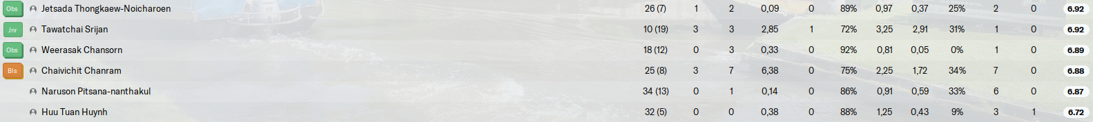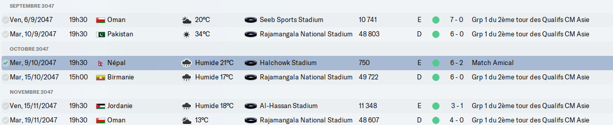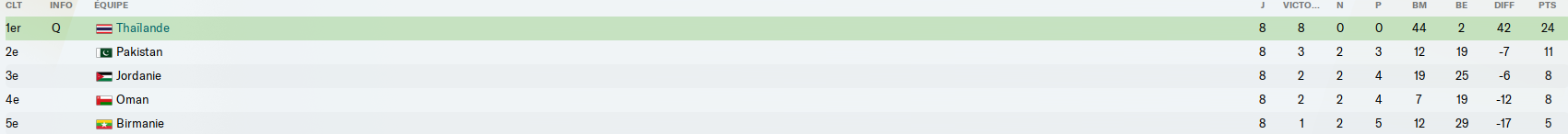 FIN de saison Ă©galement avec la Thailande oĂč lâon obtient la qualification pour la suite assez facilement avec a chaque fois des gros scores