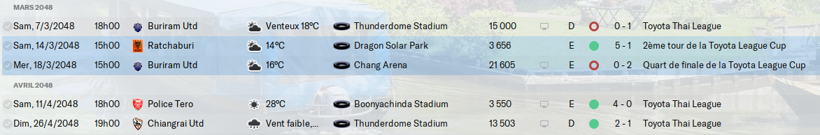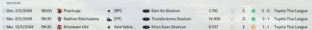 Fin de championnat avec le dĂ©nouement final, on remporte assez facilement deux matches avant de craquer et de faire un match nul contre Khonkaen United qui nous coĂ»te trĂšs cher âŠ