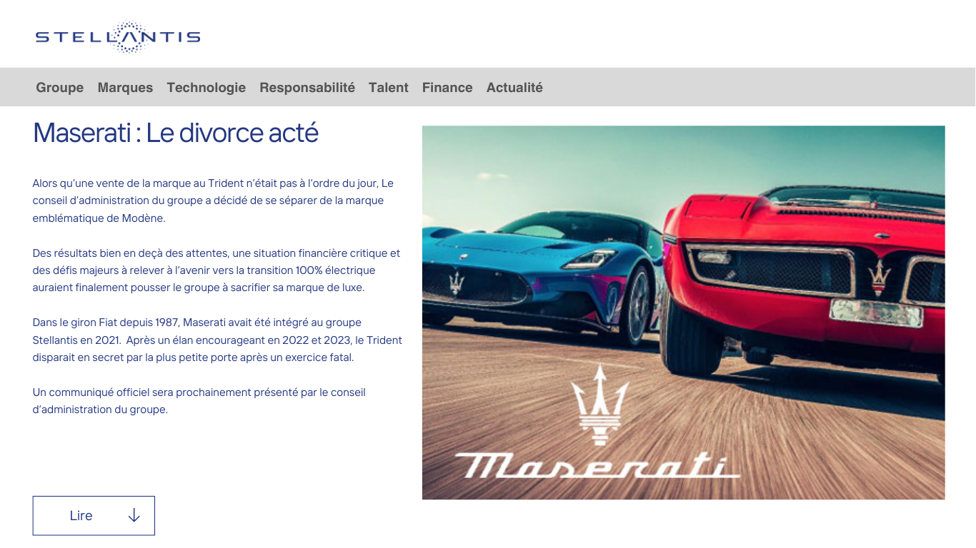 Au sein de groupe Stellantis, il y avait des marques qui se muait beaucoup plus facilement avec les nouvelles directives. Maserati nâĂ©tait pas lâune dâentre elles. Le Trident ne pouvait pas purement et simplement devenir la Tesla italienne. Cela ne collait pas Ă son essence, et surtout le marchĂ© nâexistait pas en lâĂ©tat et Ă ces tarifs lĂ .