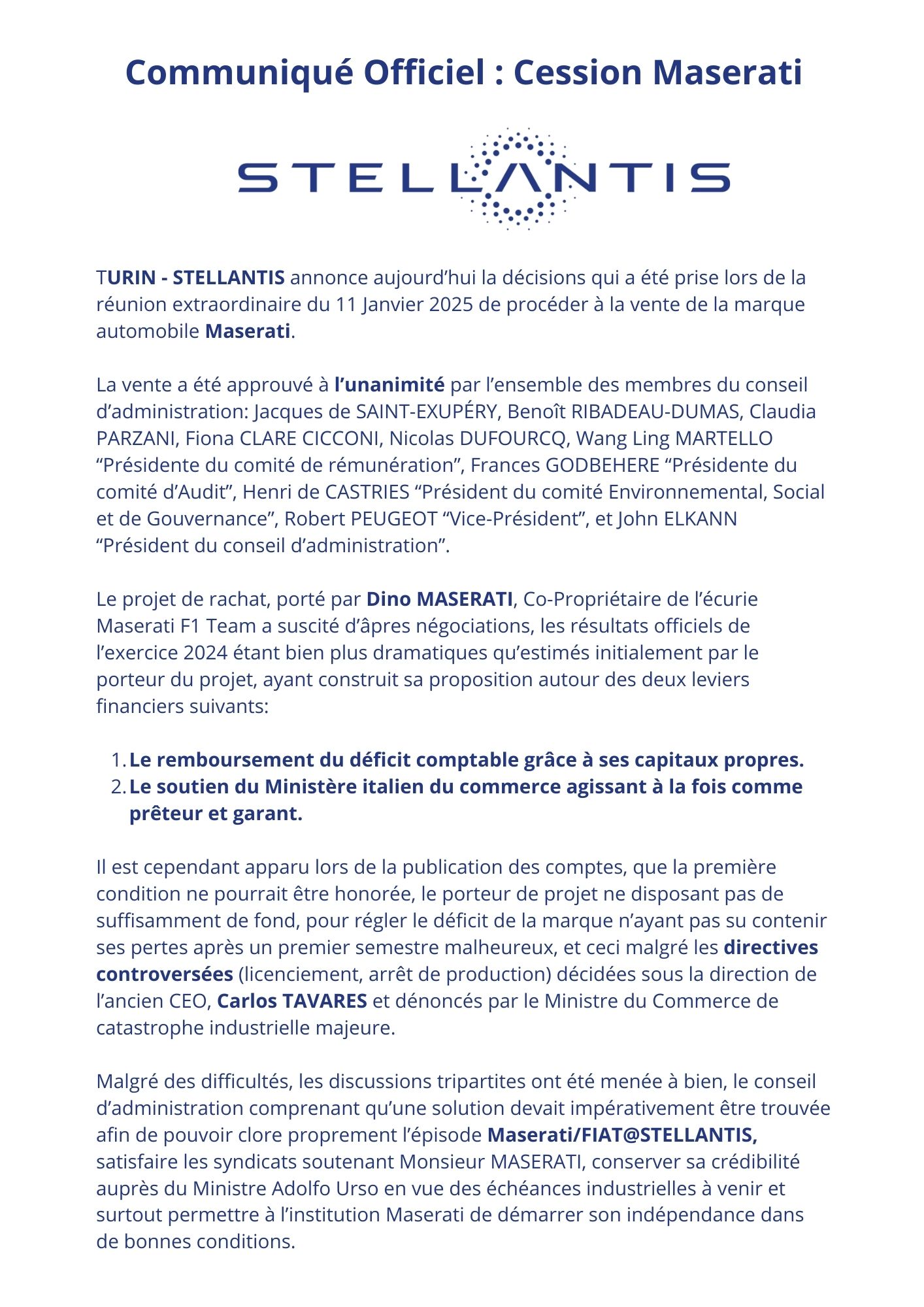 Je dois par ailleurs donner une confĂ©rence de presse le 20 Janvier afin dâannoncer mes premiĂšres dĂ©cisions en tant que propriĂ©taire de Maserati et faire le point sur lâannĂ©e Ă venir en F1.