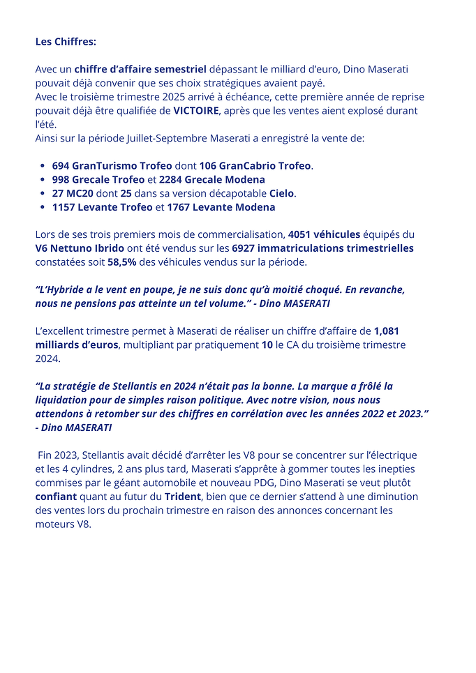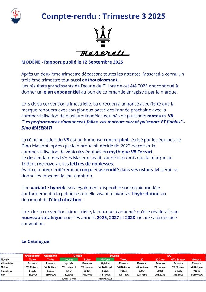 Ă la fin du mois de Septembre, une nouvelle convention Maserati sâĂ©tait tenue pour lâannonce des rĂ©sultats du troisiĂšme trimestre et des nouveautĂ©s Ă venir pour la marque au Trident pour lâannĂ©e Ă venir.