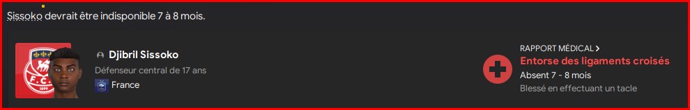 Par contre encore un blessé, je perd mon latéral gauche pour 3 semaines.
