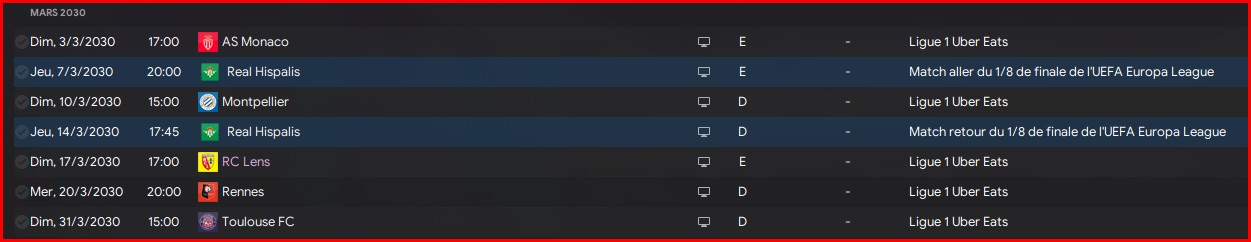 Mois assez chargĂ© avec 7 matchs + lâentrĂ©e en 8 eme de Ligue europa.