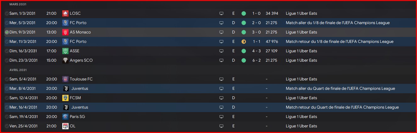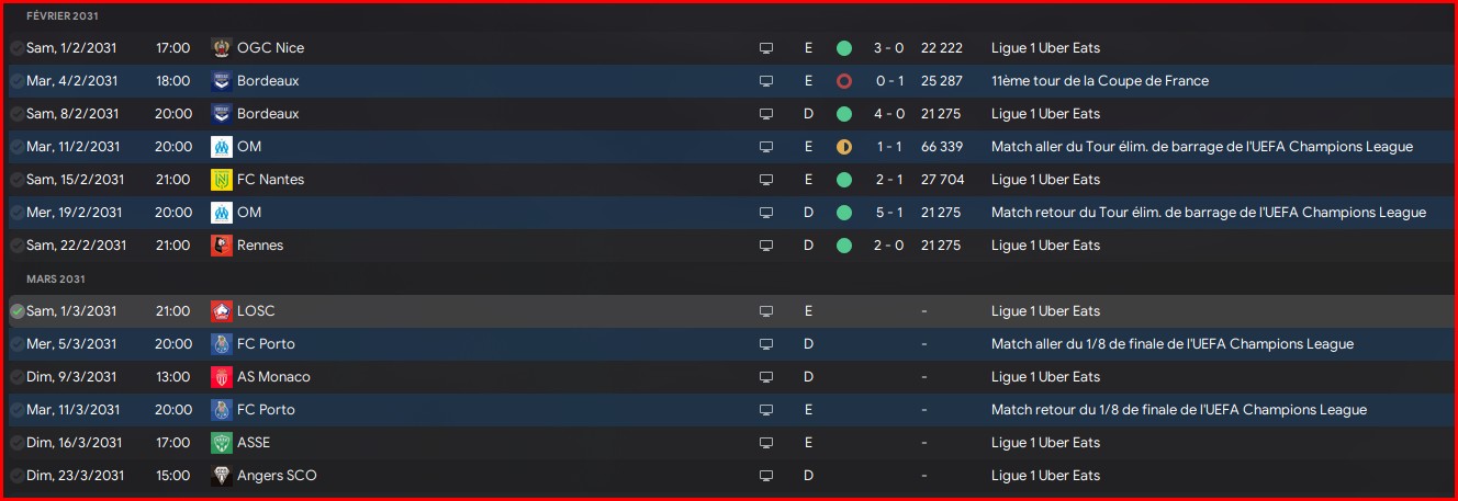 Programme plus léger en championnat. Le calendrier pourra changer à cause de la coupe de France.