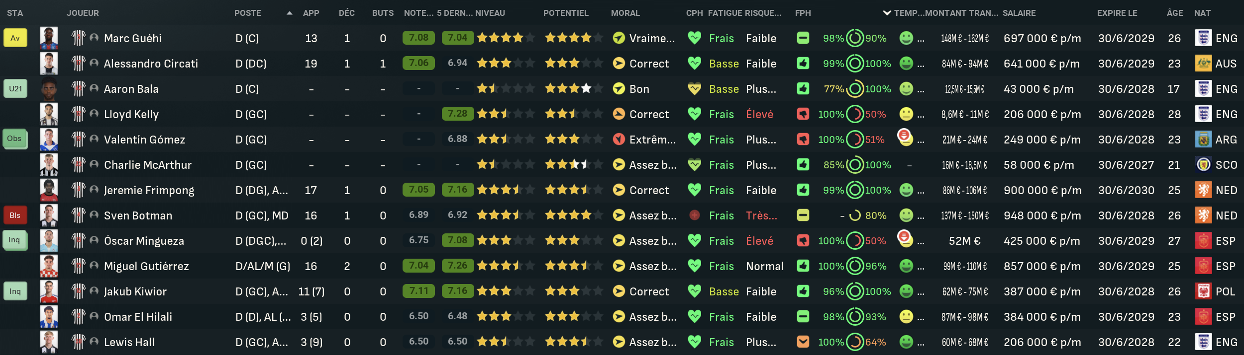 A gauche, nous avons Miguel GutiĂ©rrez en titulaire qui est arrivĂ© lui aussi y a 1 an pour 35M⏠en provenance de Girona. Je ne le trouve pas exceptionnel Ă voir. Il est suppléé par Lewis Hall qui peine Ă sâimposer et Ă montrer tout ce quâon pensait de lui en Angleterre. A voir si son meilleur poste est arriĂšre gauche ou milieu axial.