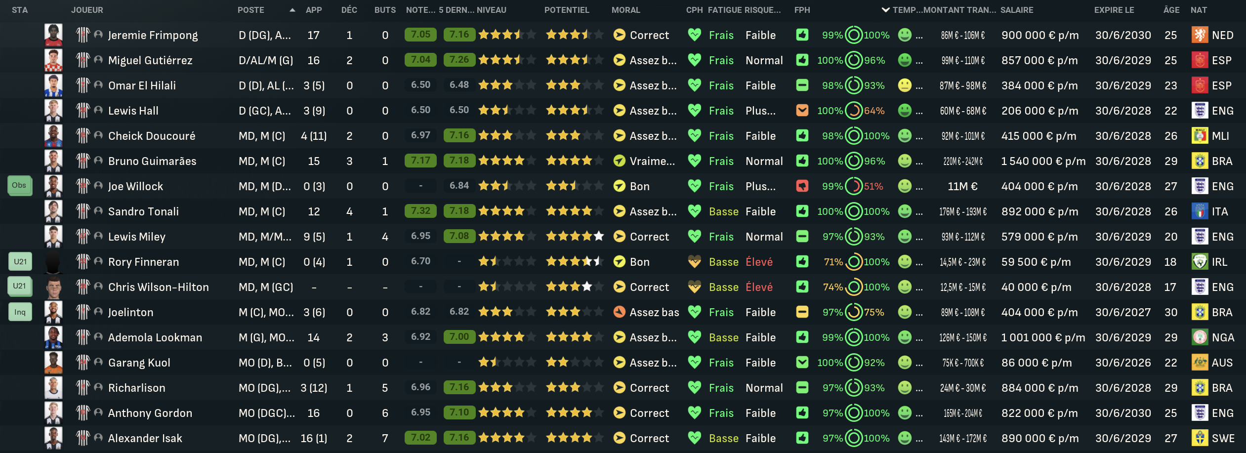 Au milieu de terrain, sur le cĂŽtĂ© gauche, nous avons Ademola Lookman qui est arrivĂ© libre cet Ă©tĂ© de lâAtalanta. Il est titulaire mais peine Ă ĂȘtre dĂ©cisif. Lui aussi va partir pour la CAN en janvier. Pas vraiment de remplaçant attitrĂ© mais plusieurs joueurs peuvent compenser son absence et je pense notamment Ă Joelinton.