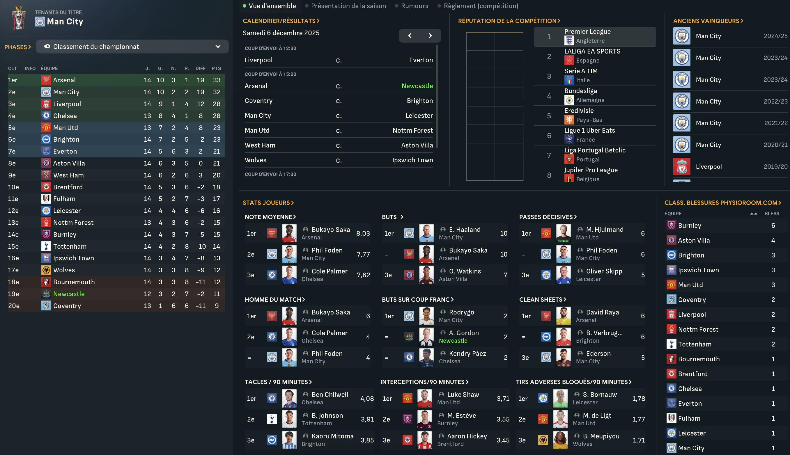 En Premier League, on doit terminer en milieu de tableau. Avec 2 matchs en retard, nous avons que 11pts Ă 10pts de la premiĂšre place qualificative en Europe. Je pense malgrĂ© tout quâon a les moyens de revenir et de titiller les places en Coupe dâEurope. On va viser le milieu de tableau comme prĂ©vu, mais je garde dans un coin de ma tĂȘte la 7Ăšme place.