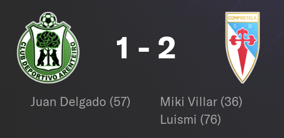 Le match le plus disputĂ© de ces quatre derniers. Arenteiro a posĂ© beaucoup de problĂšmes mais le groupe a su rĂ©pondre prĂ©sent. LâĂ©galisation nâa pas dĂ©stabilisĂ© les Compostellans qui ont su maintenir leur calme pour reprendre lâavantage en fin de match (2-1) grĂące Ă Luismi. Le combat a Ă©tĂ© rude mais la volontĂ© et lâenvie ont fait la diffĂ©rence.