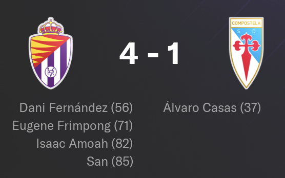 DĂšs la deuxiĂšme journĂ©e, les Compos sâinclinent sur le terrain du Valladolid B. Si tout avait bien commencĂ© avec un but en premiĂšre mi-temps, la suite tourne au cauchemar. Inexistants au retour des vestiaires, les Compostelans sâeffondrent, encaissant quatre buts en 45 minutes. Score final : 4-1.
