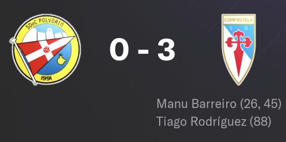 Le dĂ©placement suivant, au Real Santander B, confirme les difficultĂ©s de lâĂ©quipe Ă lâextĂ©rieur. Une rencontre serrĂ©e, globalement Ă©quilibrĂ©e, mais qui bascule sur un seul temps faible. Un gros quart dâheure dâerrements dĂ©fensifs suffit aux locaux pour marquer. Compostela ne reviendra pas. Une dĂ©faite 1-0 qui laisse un goĂ»t amer.