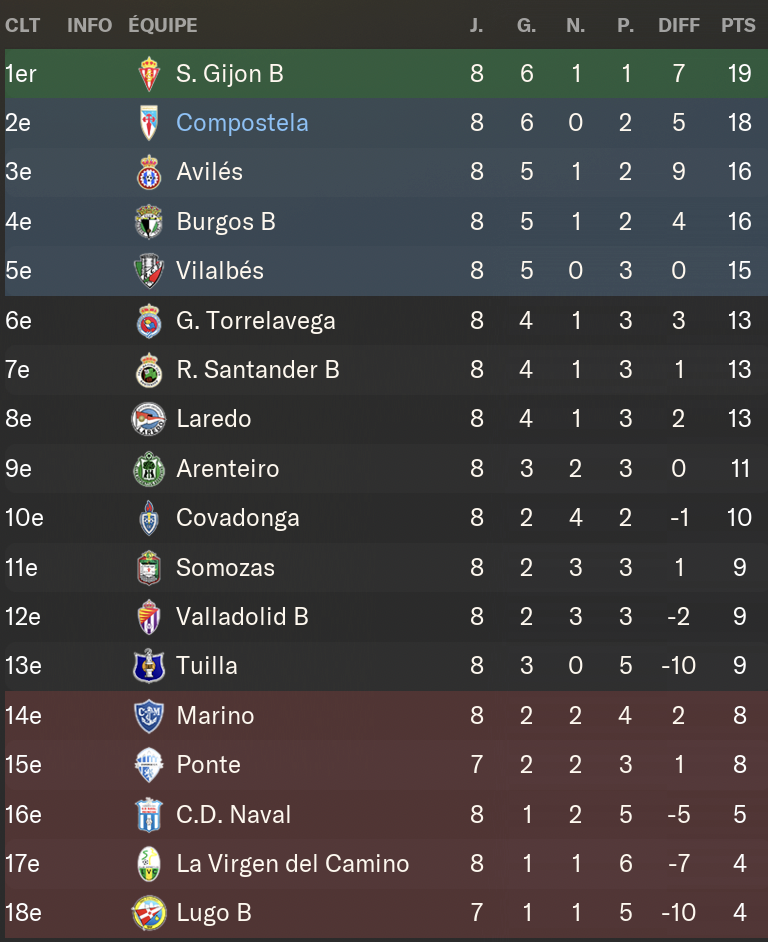 AprĂšs 8 journĂ©es, la SD Compostela se place en seconde position du championnat avec 6 victoires et 2 dĂ©faites. Un dĂ©but de saison prometteur mais qui rĂ©vĂšle aussi la marge de progression de lâĂ©quipe. Le groupe semble monter en puissance au fil des matchs, trouvant de plus en plus dâautomatismes et une soliditĂ© dĂ©fensive qui fait la diffĂ©rence.