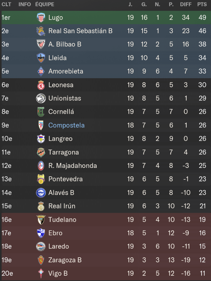 La diffĂ©rence de niveau avec les Ă©quipes de tĂȘte est palpable mais la SD Compostela nâa pas Ă rougir de ses performances. Il reste encore beaucoup Ă faire mais cette premiĂšre moitiĂ© de saison prouve que le club peut se maintenir et mĂȘme surprendre dans cette nouvelle division.