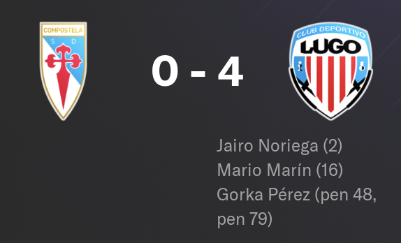 Compostela subit une lourde dĂ©faite 4-0 contre Lugo devant son public. Le match commence mal avec une ouverture du score rapide des visiteurs (2â). MalgrĂ© quelques bonnes sĂ©quences de jeu, les compostellans sont submergĂ©s dans lâensemble de la partie et encaissent deux penaltys (48â et 79â). MalgrĂ© lâenvie de rĂ©agir, lâĂ©quipe nâarrive pas Ă inverser la dynamique et sâincline sĂ©vĂšrement.