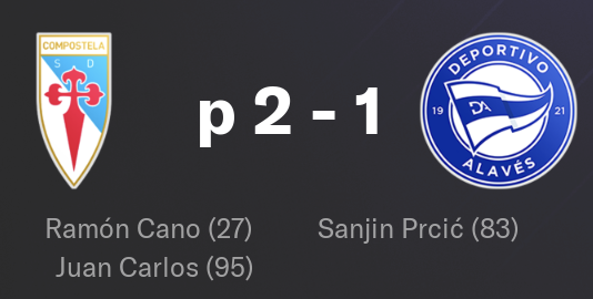 Devant son public, Compostela rĂ©ussit lâexploit de sâimposer 2-1 contre AlavĂ©s en Coupe dâEspagne au bout des prolongations. AprĂšs lâouverture du score par le jeune RamĂłn Cano (27â), le match se poursuit et AlavĂ©s Ă©galise en toute fin de match (83â). Câest Juan Carlos qui inscrit le but de la victoire pendant les prolongations (95â) et propulse les Compos au prochain tour.