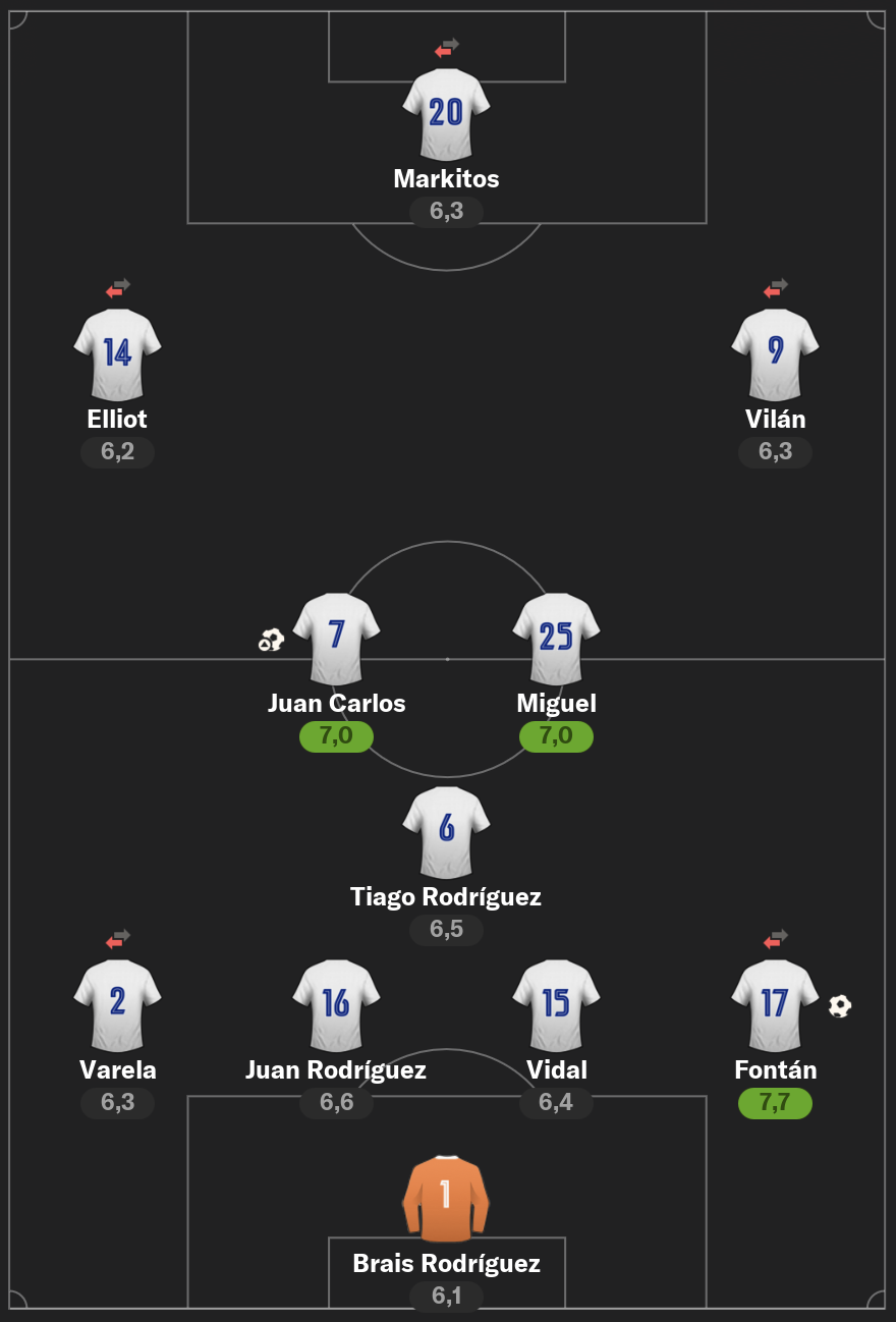 Ă la 58e, aprĂšs un corner mal repoussĂ© par la dĂ©fense adverse, Javi FontĂĄn parvient Ă rĂ©duire lâĂ©cart dâune frappe puissante dans la surface sur un service de Juan Carlos. Ce but redonne un peu dâespoir Ă lâĂ©quipe mais il sera finalement insuffisant pour renverser le cours du match.