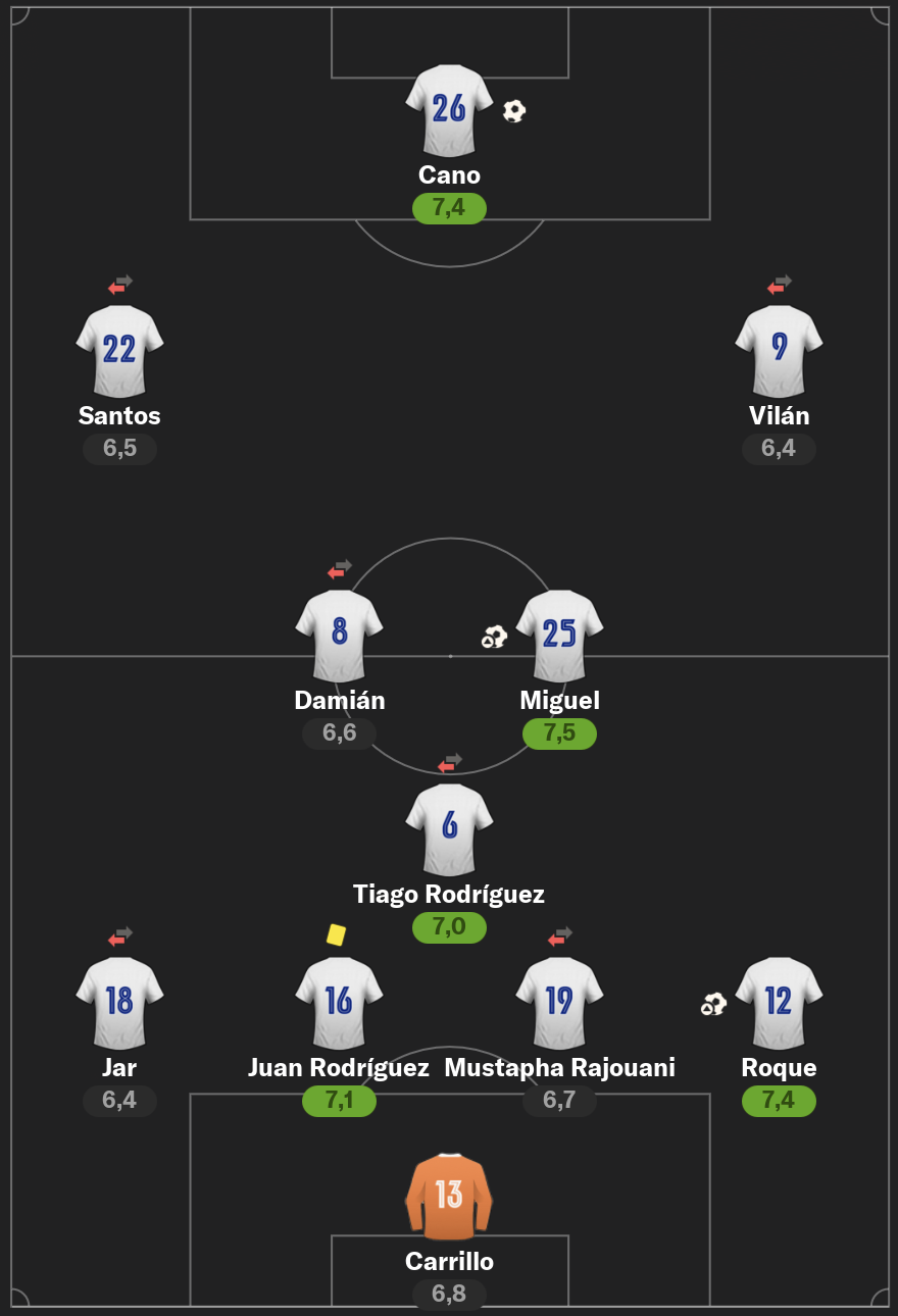 Ă la 34e minute, Pablo DurĂĄn Ă©galise sur une superbe passe en profondeur de Miguel RomĂĄn. Quelques minutes plus tard, Ă la 38e, Juan Carlos prend ses responsabilitĂ©s et transforme un penalty, donnant lâavantage aux locaux. Le rythme du match se durcit et la pression se fait ressentir.