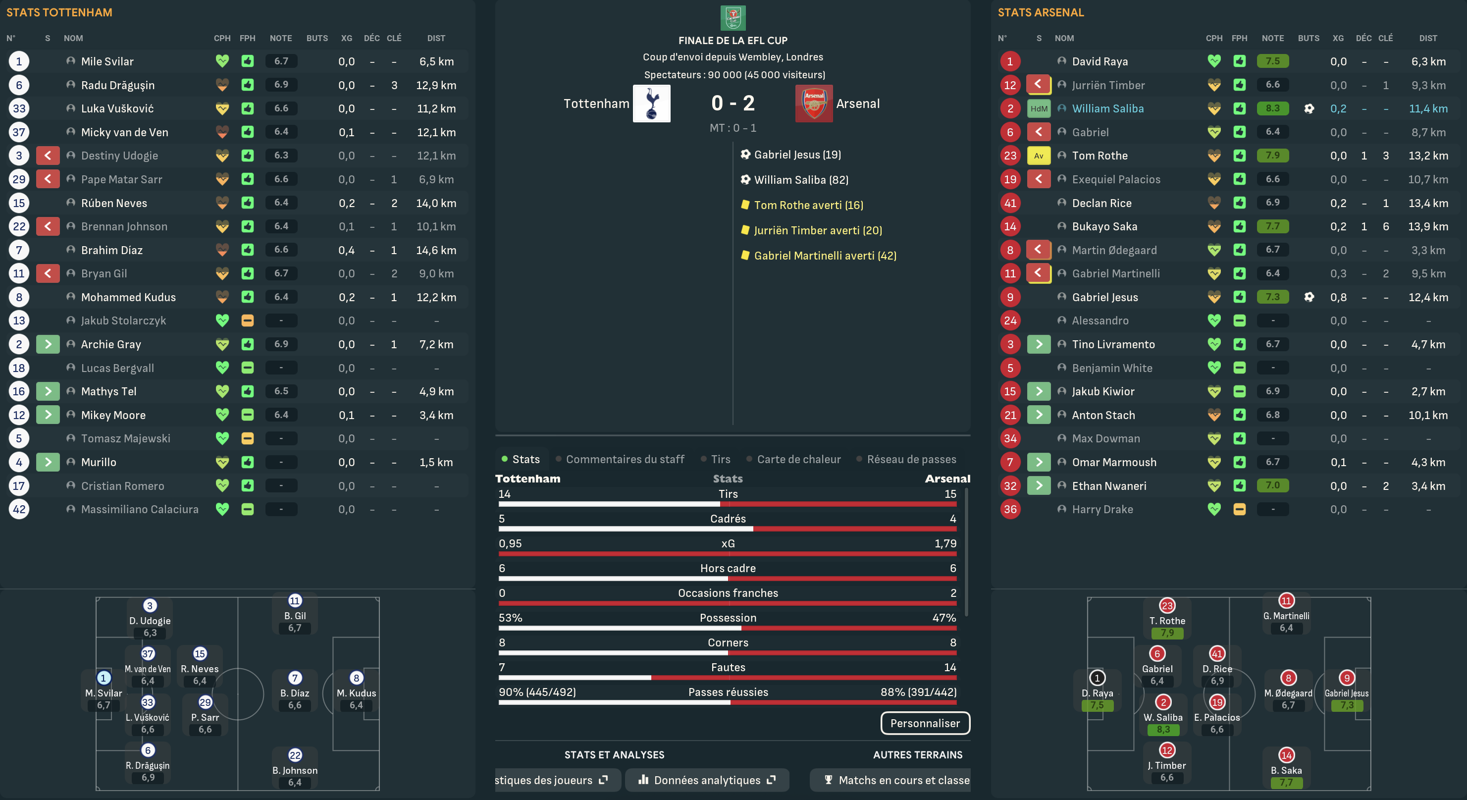 Dans un Wembley plein à craquer, chauffé à blanc par les deux camps, le début de match était rugueux. Fautes à répétition, coups francs dangereux pour les Spurs, mais c’est Arsenal qui ouvrait le score : un contre supersonique, un déboulé de Rothe sur l’aile, un centre arraché de justesse, et Jésus qui profitait de la confusion pour pousser le ballon au fond. 0-1, 21ème minute.