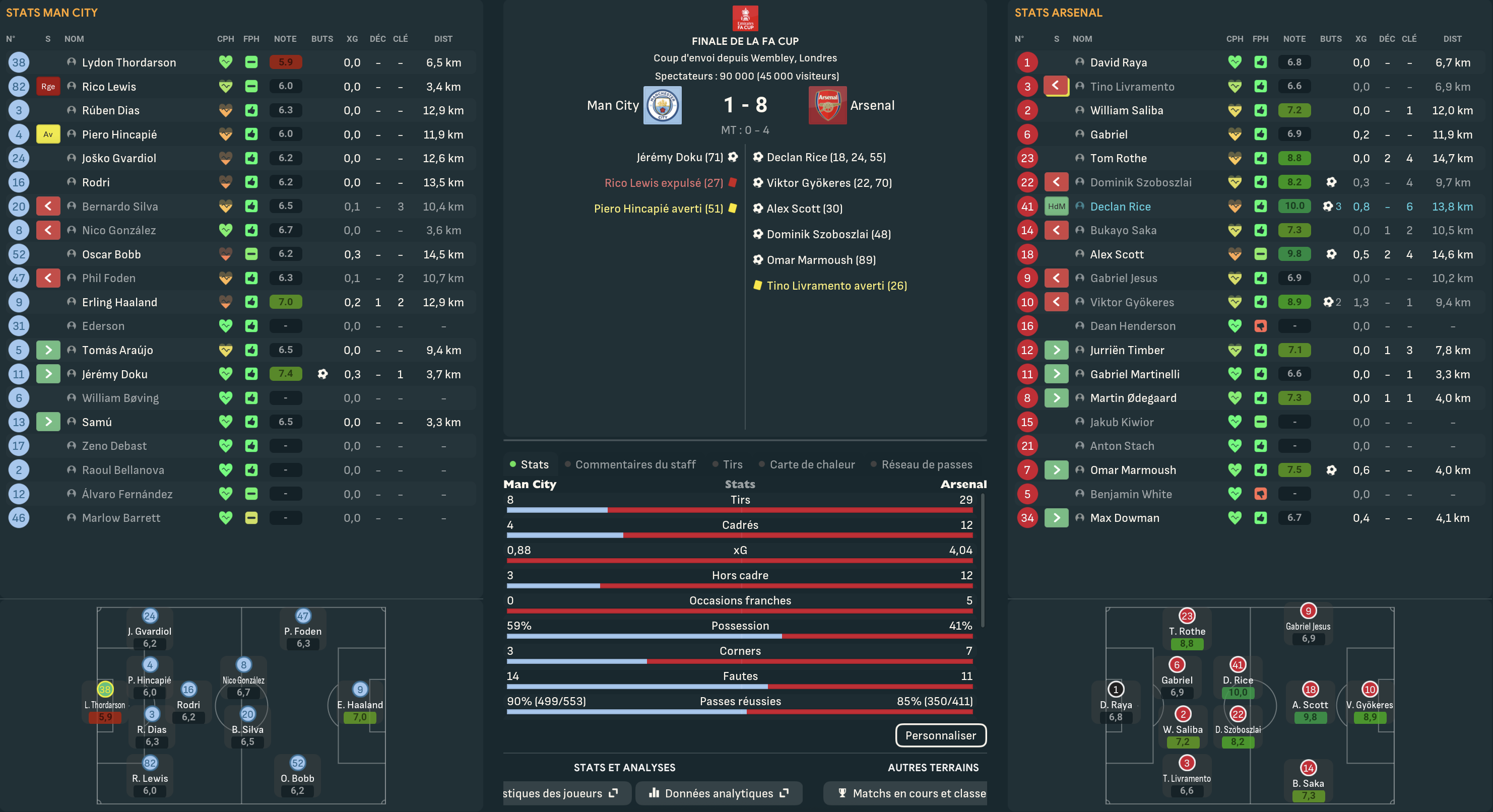 Jamais rassasié, à la 89ème les Gunners intercepte le ballon devant la défense, Timber est lancé et centre. Le ballon passe dans une forêt de jambe pour atterrir dans les pieds de Marmoush au second poteau qui y va de son but. 1-8
