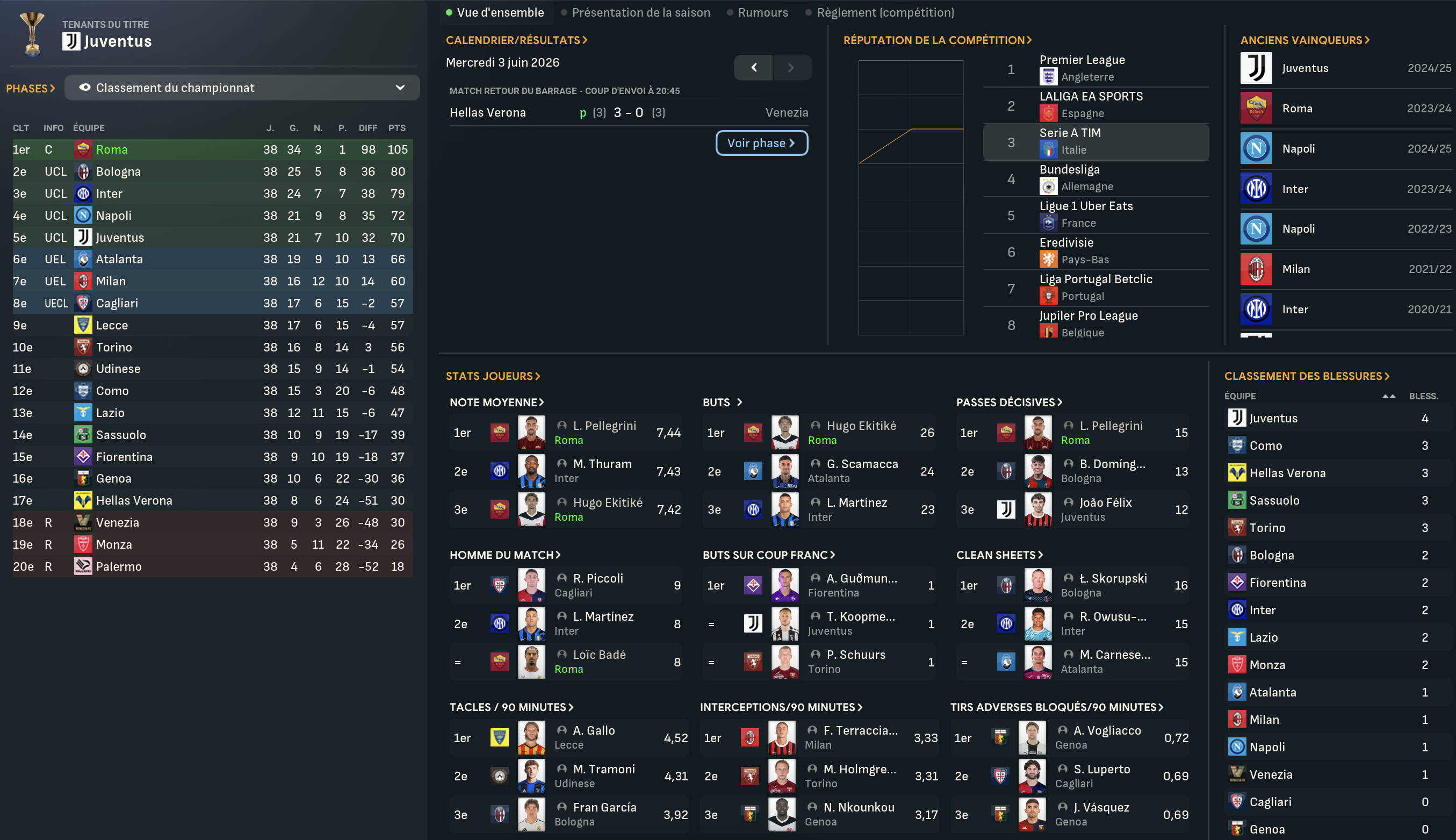 Ce succès, à sept journées de la fin, a mathématiquement offert le titre à l’AS Roma. Mais dans le vestiaire, Ju a immédiatement rappelé une règle d’or : pas question de se relâcher. Et ses hommes l’ont prouvé.
