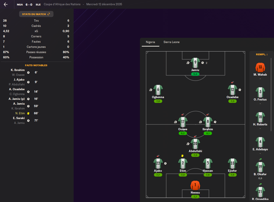 59e minute, Jamiu met le 5e but et Saraki, rentré à la place d’Osadebe, mettra le 6e à la 71e sur une passe de Jamiu. Le match fut parfait pour les Super Eagles.