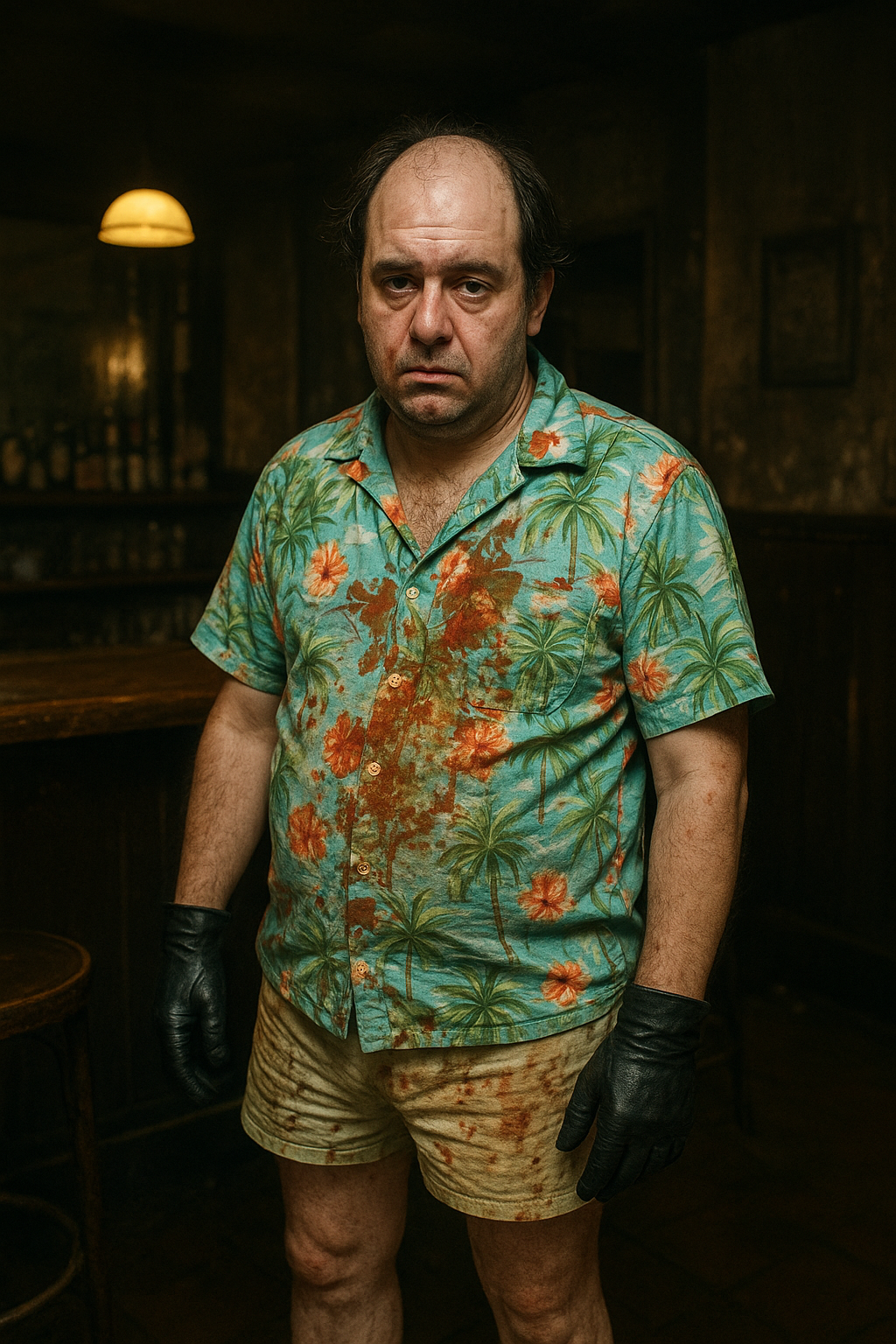 LĂ , Ă lâopposĂ© de la piĂšce, un homme dâune quarantaine dâannĂ©e, en chemise hawaĂŻenne tĂąchĂ©e de ketchup et avec un short trop court tout aussi sale, quelques rares cheveux, gras bien entendu et des gants en cuir, descend les escaliers. Il vient sâassoir Ă la mĂȘme table que Loozar, Pikouse et Toopil.