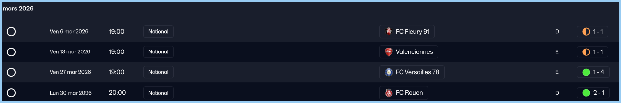 On se dĂ©place en rĂ©gion Parisienne pour ce match contre Fleury 91. Un match qui a Ă©tĂ© reportĂ© dĂ©jĂ deux fois mais cette fois câest la bonne. Ca va partir dans tous les sens, et Ă chaque fois que lâon marque Fleury Ă©galise quelques minutes plus tard. Tout se passe en premiĂšre mi-temps et la seconde est bien plus calme et les choses en resteront lĂ . Sur cette rencontre, on ne mĂ©ritait pas de gagner, le nul semble ĂȘtre un bon compromis.