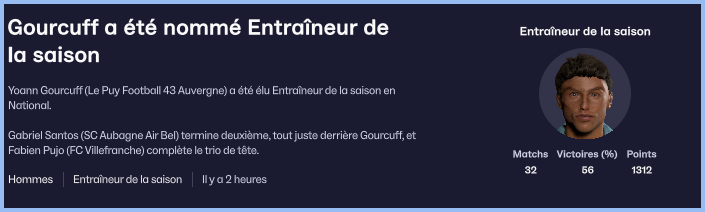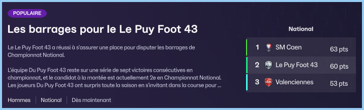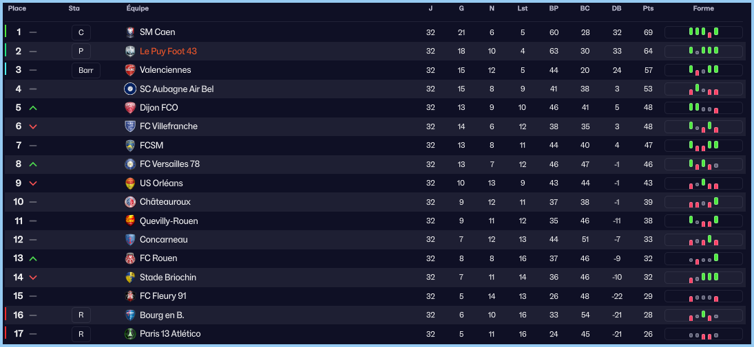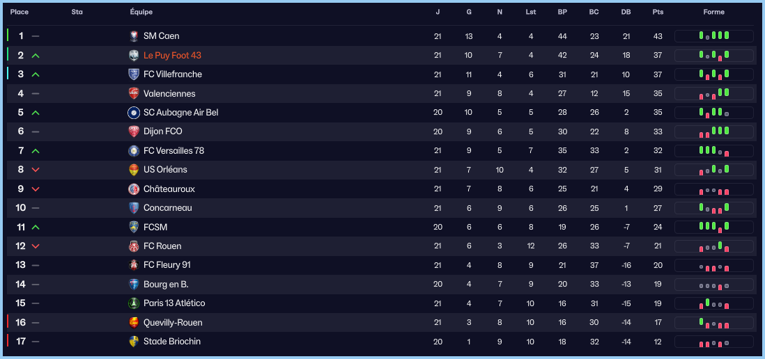 On termine le mois avec la rĂ©ception du leader, Caen. Un match qui va nous montrer quâils ne sont pas dans la mĂȘme catĂ©gorie que nous. A la fin de la premiĂšre mi-temps, nous sommes menĂ©s 3 Ă 0. Caen est au-dessus et nous domine dans tous les secteurs. Yoann remotive ses troupes dans les vestiaires, mais cela nâempĂȘchera pas Caen de remporter la victoire malgrĂ© deux buts du Puy qui ont profitĂ© du relĂąchement des Caennais. Au final, on limite la casse mais on voit clairement la diffĂ©rence avec une Ă©quipe candidate Ă la montĂ©e en Ligue 2.