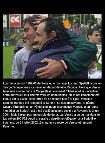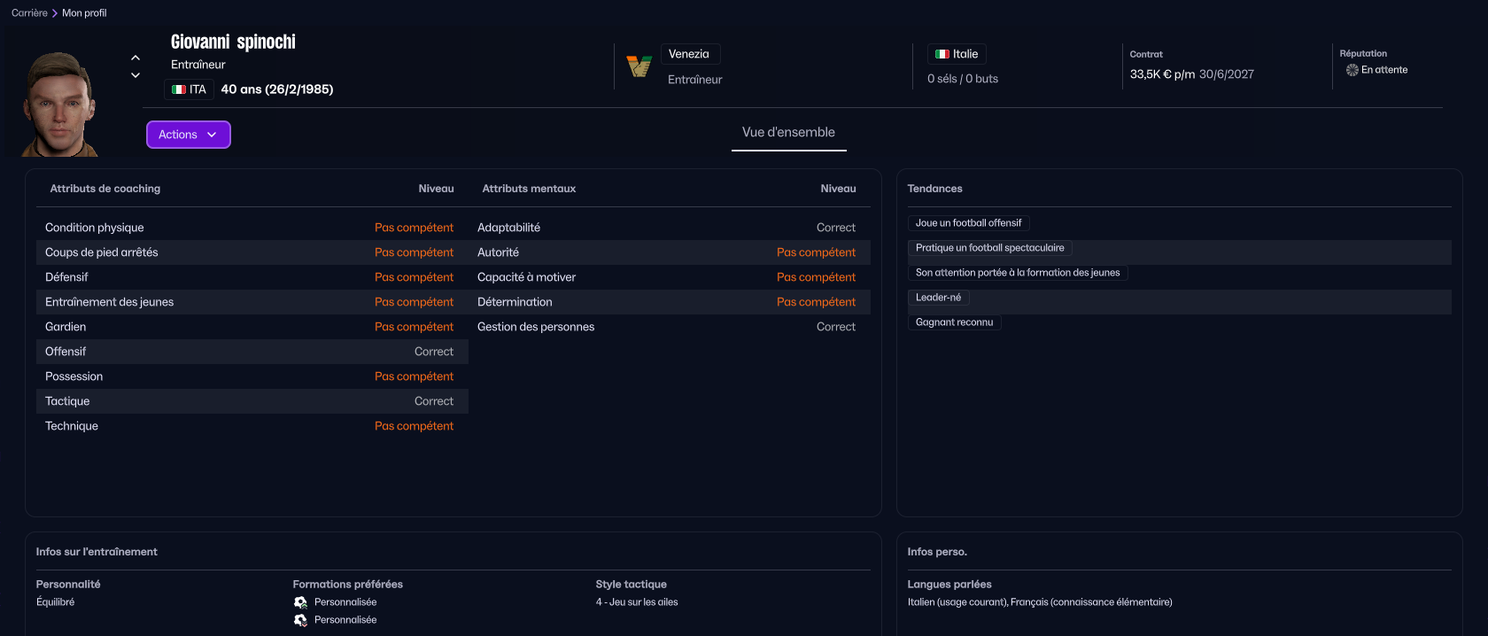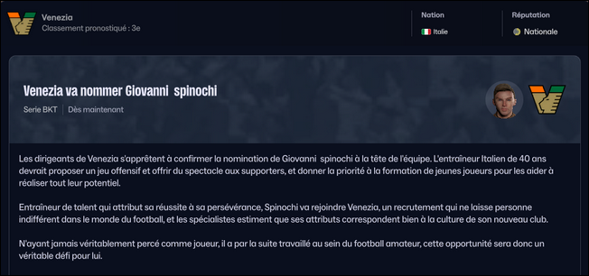Giovanni Spinochi est un jeune entraineur de 40 ans né à Vérone. Il a commencé le foot à l’âge de 5 ans dans un petit village à côté de Vérone. Sa seule expérience en terme d’entraineur c’est des jeunes au niveau amateurs. Il a arrêté le foot à l’âge de 35 ans. Il veut néanmoins rester dans le monde footballistique en devenant entraîneur et il a eu la chance d’obtenir le poste du club de Venezia FC. C’est un pari du club de prendre un entraineur sans vraiment d’expérience du monde professionnel et sans grand diplôme mais le club espère que Spinochi apportera sa fougue et son envie pour faire grandir le club.