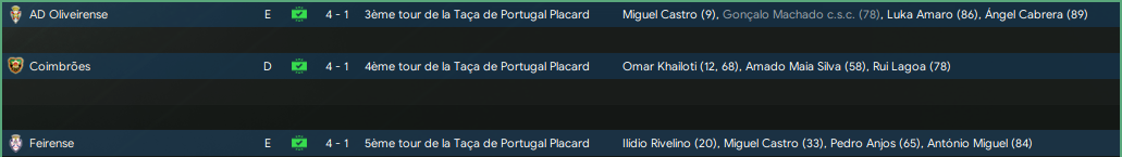 « En revanche en Coupe du Portugal câest totalement autre chose, puisquâon est sur une trĂšs belle rĂ©gularitĂ© avec 3 victoires 4-1 consĂ©cutives face Ă 3 clubs de seconde et troisiĂšme division. On notera que le danger vient de partout puisque 2 des 3 matchs ont eu 4 buteurs diffĂ©rents, et seul Khailoti a su mettre un doublĂ© sur corner face Ă Coimbroes. On peut avoir des ambitions dans cette coupe cette saison, Ă nous de tenir notre nouveau rang. »