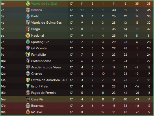 "Sans trop de surprise, nous sommes en tĂȘte du classement mais Benfica est juste derriĂšre, puisquâeux aussi nâont perdu quâune fois. Heureusement on peut compter sur notre excellente diffĂ©rence de buts, meilleure attaque avec 41 buts marquĂ©s mais surtout meilleure dĂ©fense avec seulement 6 petits buts encaissĂ©s. DerriĂšre, lâĂ©cart est loin dâĂȘtre fait puisque Porto nâest quâĂ 5 points, Guimaraes et Braga (qui nâa Ă©galement quâune dĂ©faite) Ă 6 points et le surprenant Nacional tient Ă©galement derriĂšre. Tout en bas, le pauvre Rio Ave semble lui condamnĂ© Ă la descente "