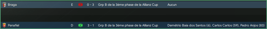 « Pas de bon parcours cette annĂ©e en revanche en Allianz Cup. On prend une claque dâentrĂ©e face Ă Braga qui se venge de lâan passĂ©. MĂȘme si on remporte le second match de poule face Ă Penafiel qui Ă©volue en D2 en faisant tourner, Baia dos Santos en profitant pour inscrire son premier but en pro, on termine 2e sur 3 en poule et notre aventure sâarrĂȘte lĂ pour cette saison. »