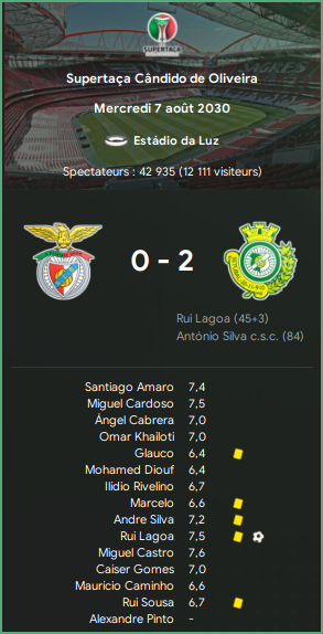 « Et câest un premier trophĂ©e depuis longtemps ! Un match maitrisĂ© de bout en bout et Lagoa nous permet dâouvrir le score juste avant la mi-temps, insĂ©rant le doute dans lâesprit des joueurs de Benfica. Alors quâils tentaient de revenir, Antonio Silva se rate complĂštement sur un centre de Castro et marque contre son camp. PremiĂšre Supercoupe pour le Vitoria de Setubal de lâhistoire du club, pour sa 3e participation aprĂšs 2005 (dĂ©faite 1-0 contre Benfica) et 2006 (dĂ©faite 3-0 contre Porto). La saison se lance de la plus belle des maniĂšres ! »