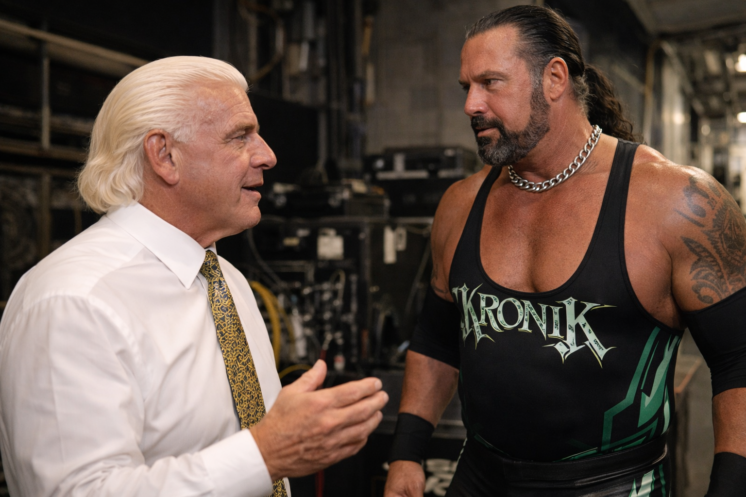 Les deux hommes se sont provoquĂ©s mercredi lors de Nitro, et Ric Flair semble particuliĂšrement agacĂ© par les propos de son adversaire. Il tient donc Ă le remettre Ă sa place et il va le dĂ©molir Ă lâextĂ©rieur du ring. Un coup dans les barricades, un coup dans les escaliers, un coup de chaise et jâen passe. Ric prend des risques, parfois mĂȘme trop et câest ce qui permet Ă Jarrett de revenir dans le match. Ric termine en sang aprĂšs reçu un coup de chaise sur le crĂąne, mais il va surprendre Jarrett et le bloquer dans Figure-Four Leglock, on pense le match perdu pour Jarrett mais câest sans compter sur lâintervention de Kanyon, qui va frapper Ric une nouvelle fois au crane avec une chaise, et qui permettra Ă Jarrett dâinverser la prise et de faire abandonner le Nature Boy Ric Flair.