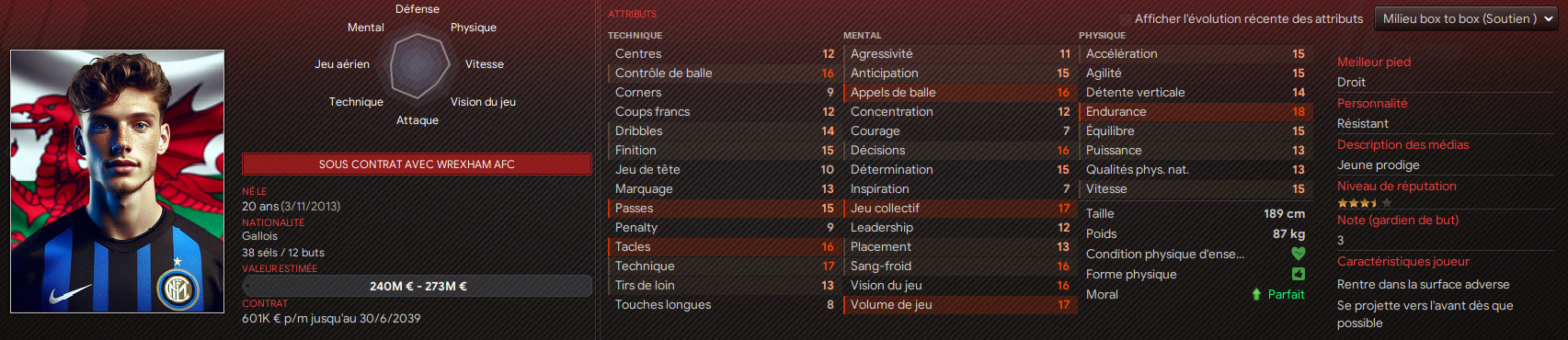 Wrexham signe un grand coup avec la venue de lâune des stars de lâĂ©quipe nationale galloise : le milieu de vingt ans Glenn Williamson est recrutĂ© pour 125 millions dâeuros Ă lâInter de Milan !! Ultra-complet dans tous les compartiments du jeu, ce joueur, qui connait bien le club pour y avoir passĂ© deux ans en prĂȘt, sera Ă coup sĂ»r lâun des joueurs clĂ©s du coach sur le terrain !!