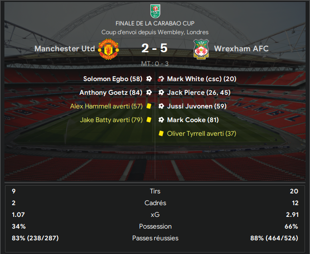 Goetz pour Manchester marqua un but sur leur seconde frappe cadrĂ©e du match, mais cette rĂ©duction du score Ă©tait anecdotique, et lâarbitre siffla la fin de la rencontre sur le score de 5-2 et sur cette magnifique victoire des gallois de Wrexham, qui remportait lĂ la troisiĂšme Carabao Cup de lâhistoire du club !!