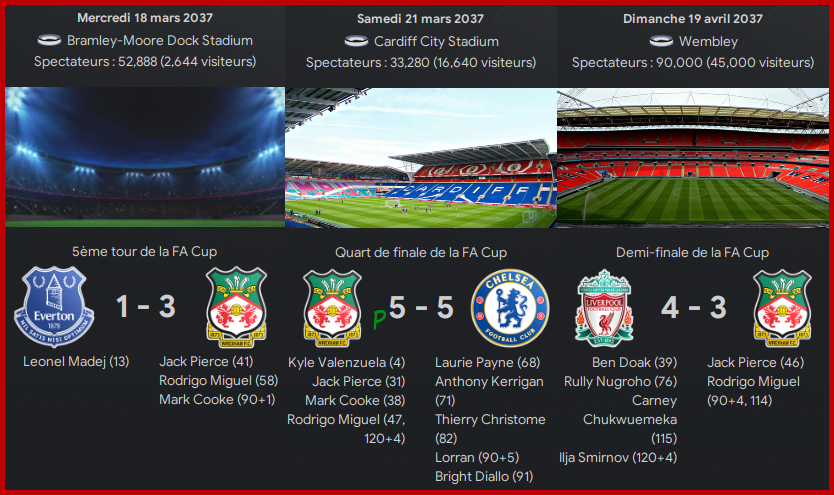 La Demi-Finale contre Liverpool sera du mĂȘme niveau question scĂ©nario, avec une Ă©galisation de Wrexham Ă la derniĂšre minute du temps rĂ©glementaire Ă 2-2 et le but de la victoire liverpuldien inscrit Ă la derniĂšre seconde des prolongations âŠ